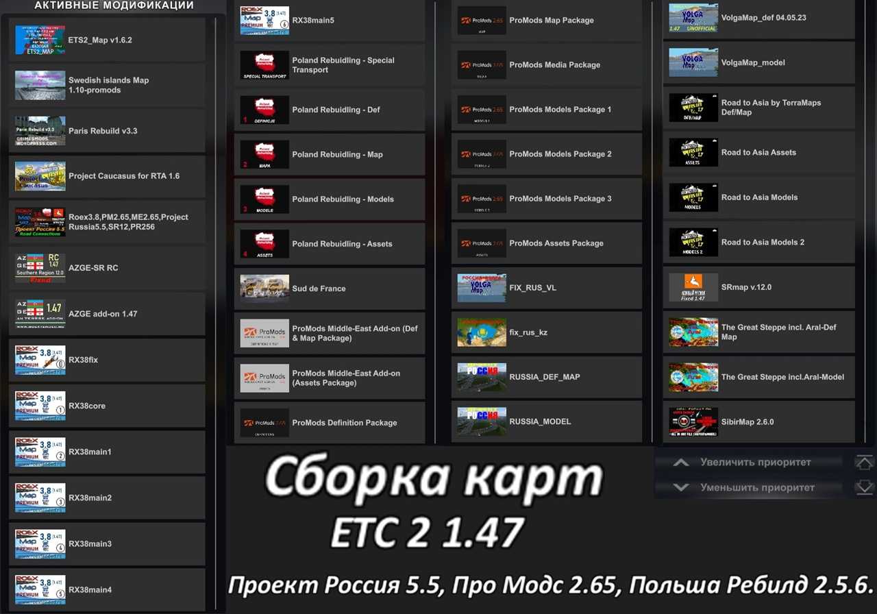 Главная » Моды для ETS 2 » Карты для ETS 2Карта Россия V5.5 ETS2 1.47 На чтение 1 мин Просмотров 74 Опубликовано 28.06.2023Карта Россия V5.5 ETS2 1.47Особенности мода:Russia Map V5.5 для ETS2 1.47.Установка : Распакуйте загруженный файл, скопируйте его в папку mod и подключите в менеджере модов. Для версии игры 1.47.xАвтор:СКАЧАТЬ “Russia Model V5.5 ETS2 1.47 – drive.google”