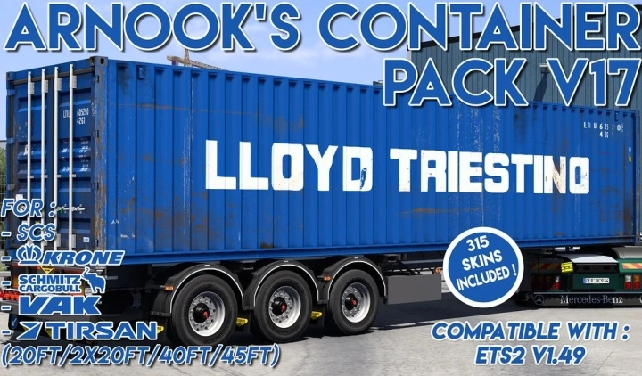 Arnooks Container Pack V17 mod для ETS2 1.49. полная совместимость с SCS, Krone, VAK V-Slider & Schmitz S.CF конфигурации шасси (HCT, B-Link, одноместные, двухместные, плоскодонки и т.д…. Все, что использует 20ft, 2x20ft, 45ft и/или 40ft) < br>доступно на рынке грузовых перевозок и для собственных прицепов