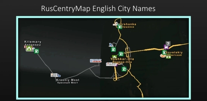 Этот мод довольно понятен, он изменяет названия городов на карте RusCentryMap должны быть на английском языке.